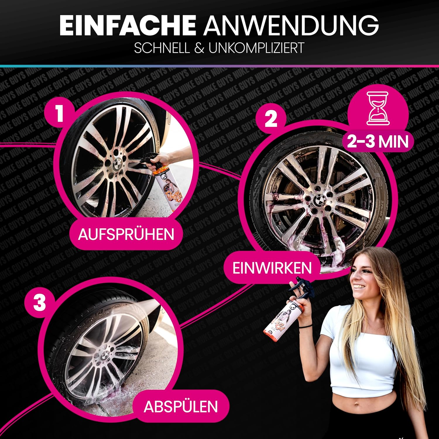 The Nuke Guys rim cleaner – a powerful, acid-free rim gel, pH neutral with purple indicator. Made in Germany. With high-quality Canyon trigger spray head