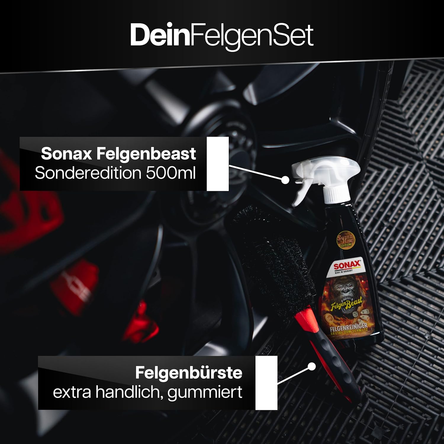 Sonax FelgenBeast is a versatile rim cleaner suitable for all types of steel and alloy rims, including painted, chrome-plated, polished and matte surfaces.